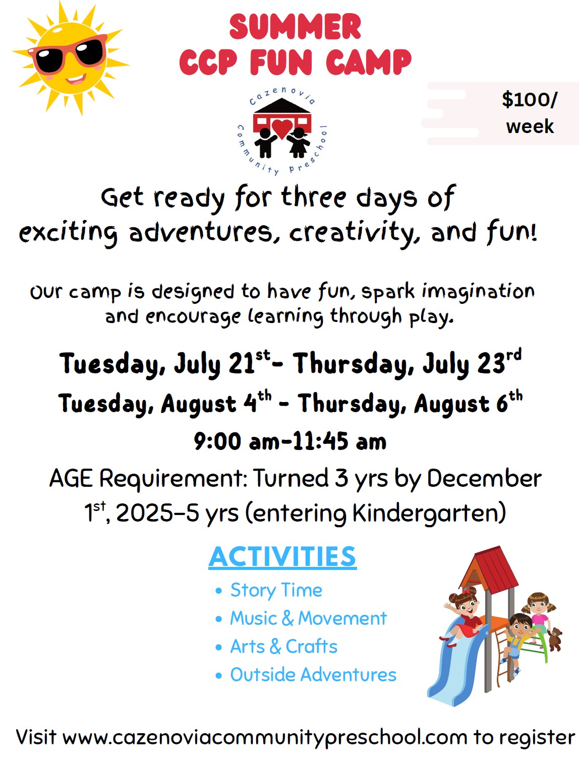 This summer we are offering two chances to join us for a fun-filled summer camp! The flyer below includes the camp theme, age ranges, dates and times, and cost to attend. If you have questions, please reach out to director@cazenoviacommunitypreschool.com